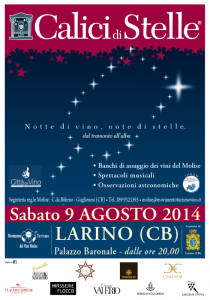 È stato presentato l’evento Calici di Stelle 2014, organizzato dal Comune di Larino e dal Movimento turismo del vino Molise, presso la sala conferenze del Comune di Larino Palazzo Ducale. Sono intervenuti il vicesindaco del Comune di Larino, Assunta D’Ermes, e il Presidente del Movimento turismo del vino Molise Gabriele Di Blasio.