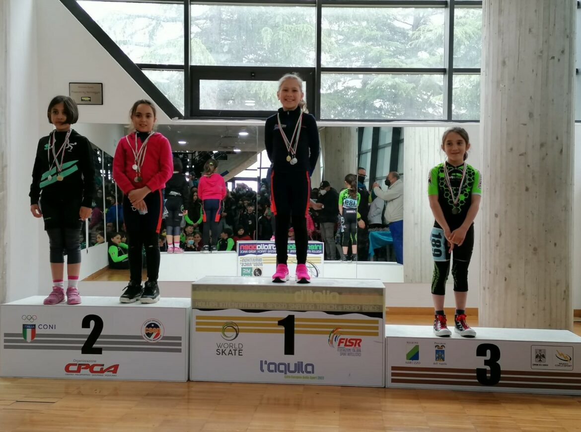 Negli esordienti, medaglia di bronzo per Caterina Di Zinno nella gara di destrezza e per Maddalena Di Zinno nella due giri sprint. Nella lunga sugli 8 giri in linea, secondo posto per Martina Palumbo e terzo posto per Sofia Macari. Ha ben figurato anche Diana Muntean in tutte le specialità.