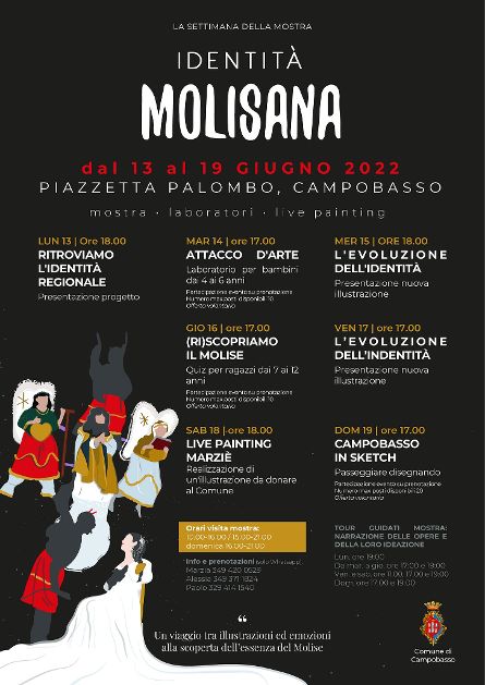 Martedì 14 giugno, parte a tutti gli effetti “Identità Molisana”, il progetto, inserito nel calendario ufficiale del Festival dei Misteri, che durerà per tutta la settimana del Corpus Domini, prevedendo vari appuntamenti, compresi laboratori didattici per bambini, tutti con base a Piazzetta Palombo. Identità Molisana, attraverso le illustrazioni di Marzia Lamelza cercherà di raccogliere l’essenza dell’identità territoriale molisana fatta di luoghi, tradizioni, sapori, ma anche di storie, modi di vivere, di sentire, di pensare. Le illustrazioni sono corredate dai testi di Alessia Mendozzi e promosse da Paolo Pasquale di Turismo in Molise.