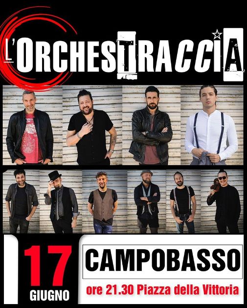 Venerdì 17 giugno, alle ore 21.30, nell’area spettacoli di Piazza della Vittoria sarà, infatti, la volta dell’Orchestraccia in concerto, gruppo itinerante folk-rock romano, che si compone in modo creativo e disordinato di attori, cantautori, musicisti, performers: Marco Conidi, Edoardo Pesce, Luca Angeletti, Giorgio Caputo e tanti altri artisti e sopraffini musicisti si aggiungono di volta in volta, come Gianfranco Mauto, Salvatore Romano, Fabrizio Lo Cicero.