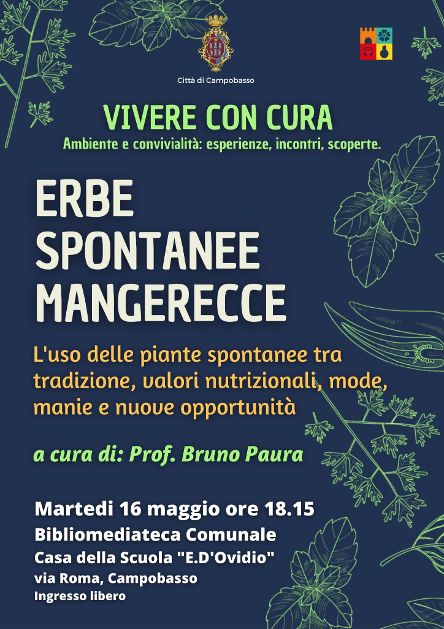 “Erbe spontanee mangerecce, tra tradizione, valori nutrizionali, mode, manie e nuove opportunità” sarà il tema del nuovo appuntamento della rassegna ‘Vivere con cura’, promossa dal Comune di Campobasso ed in programma domani, martedì 16 maggio, presso i locali della Bibliomediateca comunale di via Roma.