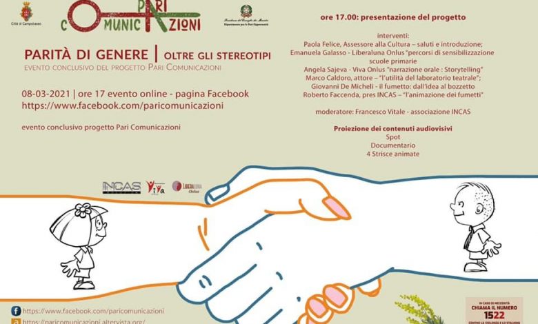Lunedì 8 marzo, in occasione della Festa della Donna, alle ore 17.00, sui canali social delle diverse associazioni coinvolte, si terrà l’evento conclusivo del progetto Pari Comunicazioni, promosso dal Comune di Campobasso e dal Dipartimento Pari Opportunità della Presidenza del Consiglio dei Ministri.