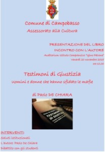 “Il testimone è costretto a scomparire, a far perdere le proprie tracce. Per la sua incolumità e per quella dei propri familiari. La legge del 2001 parla di ‘maggiore anonimato possibile’. Un vero e proprio stravolgimento: nella vita quotidiana, nel lavoro, nelle abitudini”. Da qui partirà il dibattito con gli studenti campobassani, che avranno modo di conoscere le storie di coloro che, a un certo punto della propria esistenza, sacrificano una vita normale per aiutare lo Stato a sconfiggere le mafie.