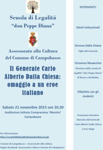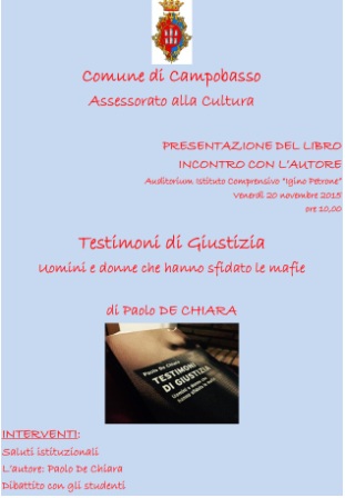 Il giorno successivo, sabato 21 novembre, sarà l’auditorium dell’Istituto Comprensivo “Montini” a ospitare il secondo appuntamento del progetto “Legalità Bene Comune”, nato dal protocollo d’intesa tra la Scuola della Legalità “don Peppe Diana”, di cui è fondatore e direttore Vincenzo Musacchio, e l’assessorato alla Cultura del Comune di Campobasso.