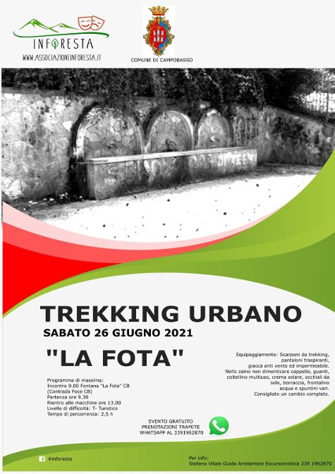 Tornano a Campobasso gli appuntamenti con il trekking urbano organizzati dal Comune di Campobasso insieme all’Associazione Inforesta e inseriti nel cartellone degli eventi di ‘Giugno in Città’ stilato dall’assessorato alla Cultura.