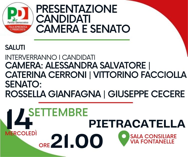 Continuano gli eventi di presentazione delle candidature in vista delle elezioni politiche. Oggi, mercoledì 14 settembre è il turno dei candidati Dem nel Fortore, a Tufara e a Pietracatella.