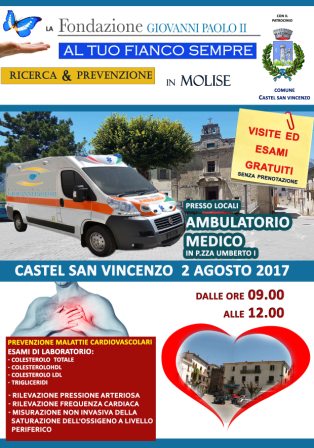 CASTELLa “carovana della salute” non si ferma e continua il suo percorso nei comuni molisani. Prossima tappa il 2 agosto a Castel San Vincenzo, centro dell’Alto Molise, conosciuto anche oltre i confini nazionali per il suo patrimonio culturale unico al mondo. Ma non saranno le bellezze artistiche protagoniste di questa iniziativa, bensì le ben più importanti “risorse umane”, ossia la popolazione.  Una giornata interamente dedicata alla Prevenzione Cardiovascolare con esami di laboratorio: colesterolo totale, colesterolo HDL,   colesterolo LDL e  trigliceridi;   elettrocardiogramma, rilevazione pressione arteriosa, rilevazione frequenza cardiaca, misurazione non invasiva della saturazione dell’ossigeno a livello periferico.  Esami effettuati in modo assolutamente gratuito, senza necessità di prenotare. L’evento rientra nel progetto a carattere sociale “Ricerca e Prevenzione in Molise”, promosso dalla Fondazione Giovanni Paolo II” sul territorio.