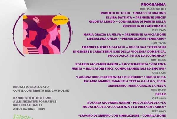 In prossimità della giornata internazionale dedicata alla violenza sulle donne, l’Associazione Liberaluna Onlus intende lanciare un messaggio concreto attraverso il seminario “Conoscere per accogliere” – patrocinato dal Comune di Oratino, Unicef e dalla Consigliera di Parità della Provincia di Campobasso, e finanziato da CSV Molise – che si terrà il prossimo 16 novembre nella sala Consiliare del Comune di Oratino a partire dalle ore 15,00.