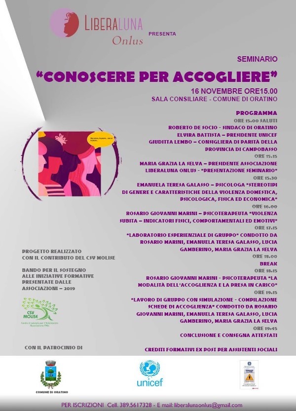 In prossimità della giornata internazionale dedicata alla violenza sulle donne, l’Associazione Liberaluna Onlus intende lanciare un messaggio concreto attraverso il seminario “Conoscere per accogliere” – patrocinato dal Comune di Oratino, Unicef e dalla Consigliera di Parità della Provincia di Campobasso, e finanziato da CSV Molise – che si terrà il prossimo 16 novembre nella sala Consiliare del Comune di Oratino a partire dalle ore 15,00.