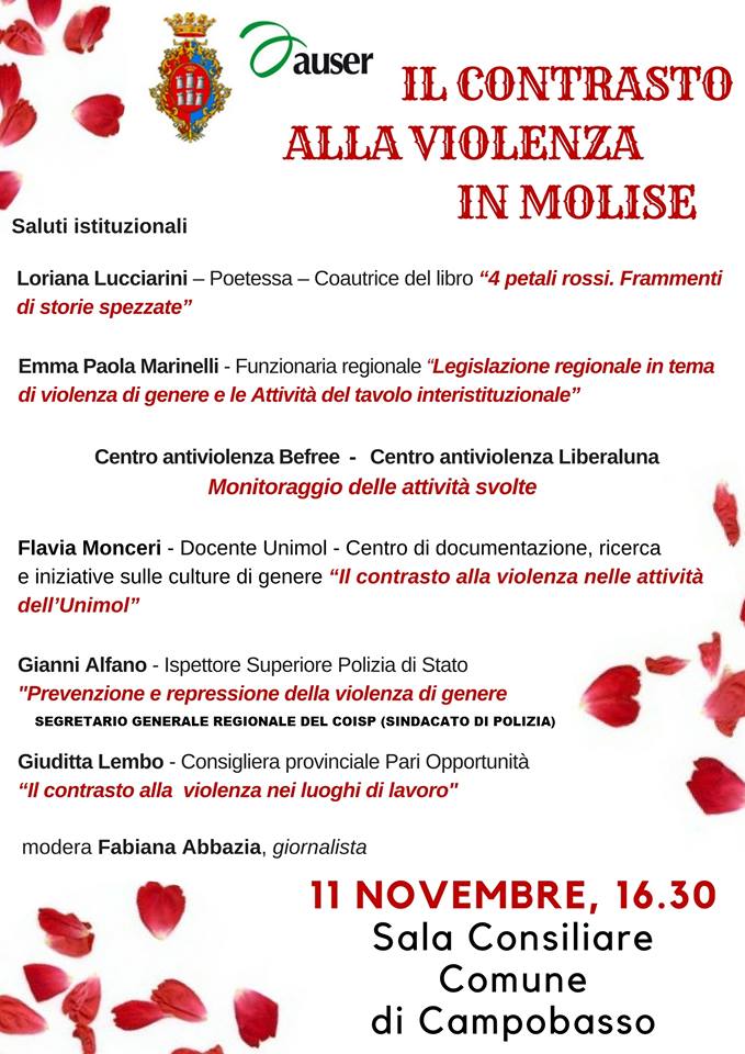 In vista della ‘Giornata internazionale per l’eliminazione della violenza contro le donne’ del prossimo 25 novembre 2017, il Comune di Campobasso, assessorato alle Pari Opportunità, e l’Auser Molise, sabato 11 novembre 2017 alle ore 16.30 presso la Sala Consiliare di Palazzo San Giorgio, promuovono l’incontro dal titolo “Il contrasto alla violenza di genere in Molise”.