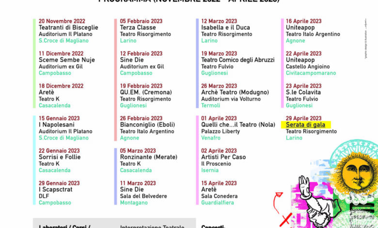 La rassegna itinerante, che terminerà sabato 29 aprile 2023 con una serata di gala a Larino, toccherà ben 13 comuni molisani e verrà presentata anche attraverso un suggestivo video spot (proiettato prima di ogni commedia) che omaggia la bellezza del nostro territorio e la passione per il teatro, che ha un forte richiamo per tutti e non conosce distinzioni sociali, limiti territoriali, ostacoli e barriere.