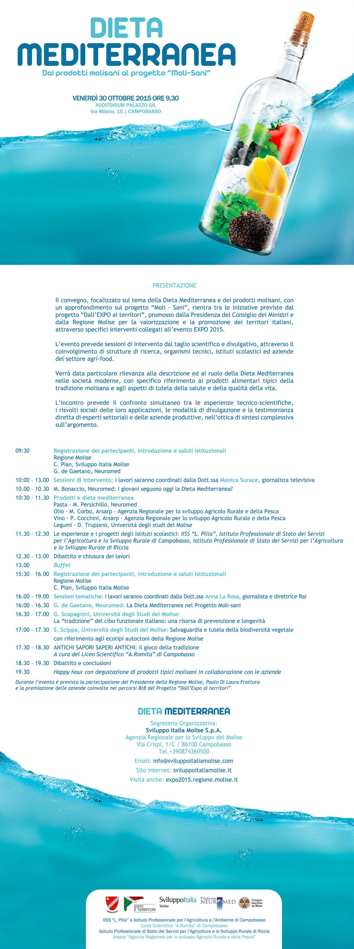 “In linea con il tema portante di Expo 2015, ‘Nutrire il pianeta – Energia per la vita’, abbiamo ritenuto giusto dedicare una riflessione di livello sull’alimentazione e in particolare sull’importanza che essa riveste per la salute di tutti noi. Sempre più crescenti, nel vivere quotidiano, la consapevolezza e la cultura che le giuste abitudini a tavola hanno riscontri positivi nel breve e lungo termine. La declinazione scientifica della nostra cucina dà sostanza alla sua qualità e alla qualità che l’intera filiera agroalimentare del Molise garantisce. Il convegno di domani sarà un prezioso focus non solo di portata divulgativa, ma anche e soprattutto di valore formativo: la nostra alimentazione dunque a beneficio della nostra salute e anche della nostra economia: la qualità della tavola molisana vista e analizzata quale opportunità di sviluppo per l’intero territorio”, dichiara il presidente della Regione Molise, Paolo di Laura Frattura.