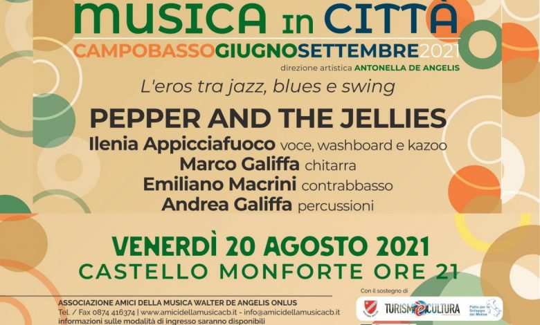 Domani, venerdì 20 agosto, alle ore 21.00, nel cortile del Castello Monforte, si terrà l’ultimo degli spettacoli musicali di “Voci dal Castello”, con il concerto della band Pepper and The Jellies, dal titolo “L’eros tra jazz, blues e swing”. Con un programma musicale che spazia da Weill, Johnson, Handy, Fitzgerald, Burnett My Melancholy, Mc Hugh-Fields, Waller-Razaf, Smith, il concerto dei Pepper and The Jellies è un viaggio che parte dal jazz tradizionale, il blues e lo swing con un particolare riferimento alle canzoni erotiche, tipiche degli anni 20 e 30, e arriva fino a successi più noti al grande pubblico.