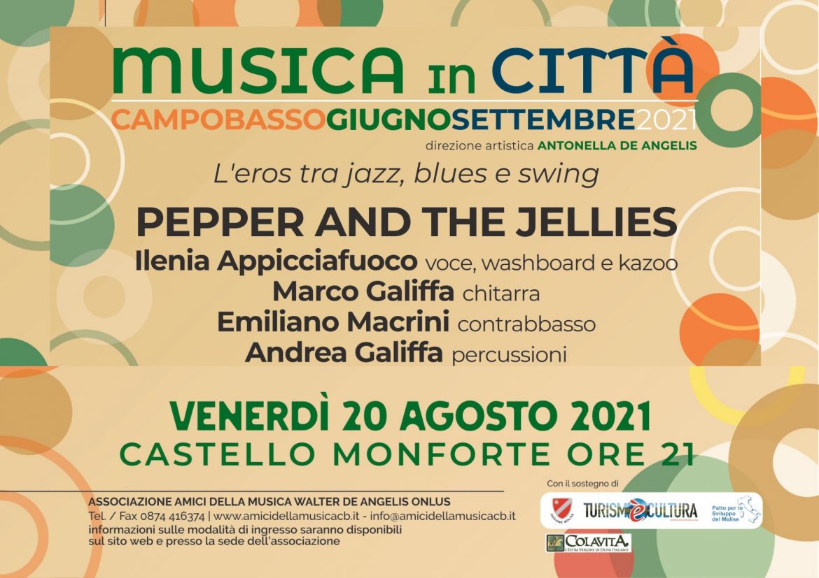 Brillantemente recensita in Italia e all’estero, la band, composta da Ilenia Appicciafuoco (voce, washboard, kazoo), Marco Galiffa (chitarra), Emiliano Macrini (contrabbasso), Andrea Galiffa (percussioni), vanta un sound particolare e riconoscibile grazie alla versatilità dei musicisti e alla voce della sua cantante e washboard player, più volte definita una delle migliori interpreti del jazz tradizionale e del blues delle origini. La band, con una formazione insolita e un sound il più possibile originale e proprio, è in grado di trascinare il pubblico nelle sonorità swing, blues e jazz tradizionali. La capacità di ogni elemento di coinvolgere l’ascoltatore rende sempre i loro concerti ideali per gli appassionati, ma anche per chi si immerge per la prima volta in questo affascinante universo. I Pepper and The Jellies hanno alle spalle 2 tour internazionali e svariati festival in Italia, Belgio, Svizzera, Francia, Irlanda, Inghilterra (Birmingham International Jazz Festival, Open Jazz Festival KotCertino, Pozzuoli Jazz Festival…). Una voce vintage, tre maestri dello swing, una musica antica, ma dal sound contemporaneo e inconfondibile, sono questi gli ingredienti inconfondibili della band Pepper and The Jellies!
