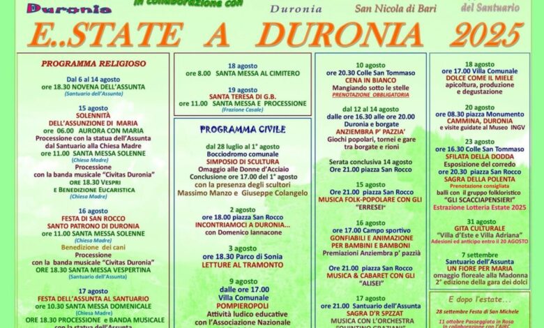 L’Associazione Pro Loco Duronia, in collaborazione con il Comune di Duronia, la Parrocchia e il Gruppo Volontari del Santuario è pronta a dare il via all’estate 2025 con eventi che vogliono mettere al centro la cultura, l’arte, la riscoperta delle tradizioni e la convivialità.