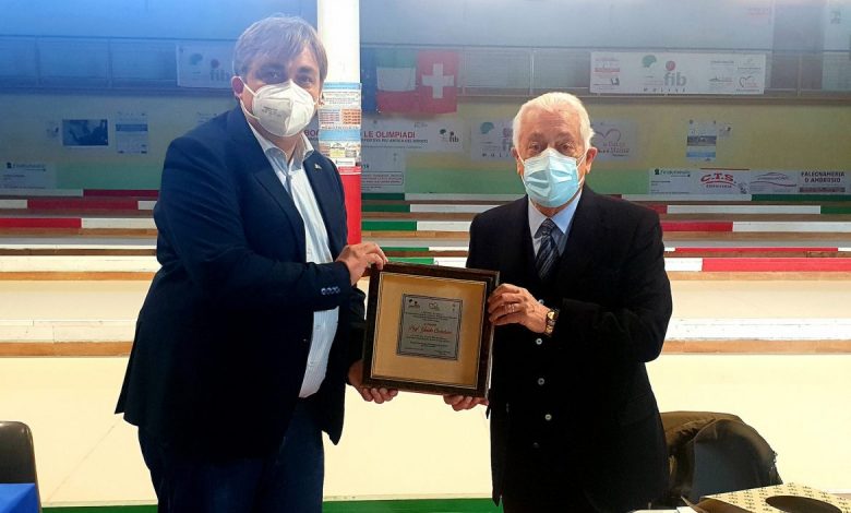 Il numero uno della FIB Molise, prima del momento elettivo, ha omaggiato il prof. Guido Cavaliere di una targa per ringraziare quanto fatto per lo sport molisano in 23 anni dal presidente uscente.