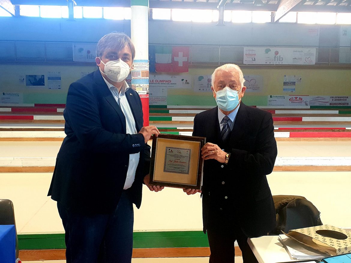 Il numero uno della FIB Molise, prima del momento elettivo, ha omaggiato il prof. Guido Cavaliere di una targa per ringraziare quanto fatto per lo sport molisano in 23 anni dal presidente uscente.