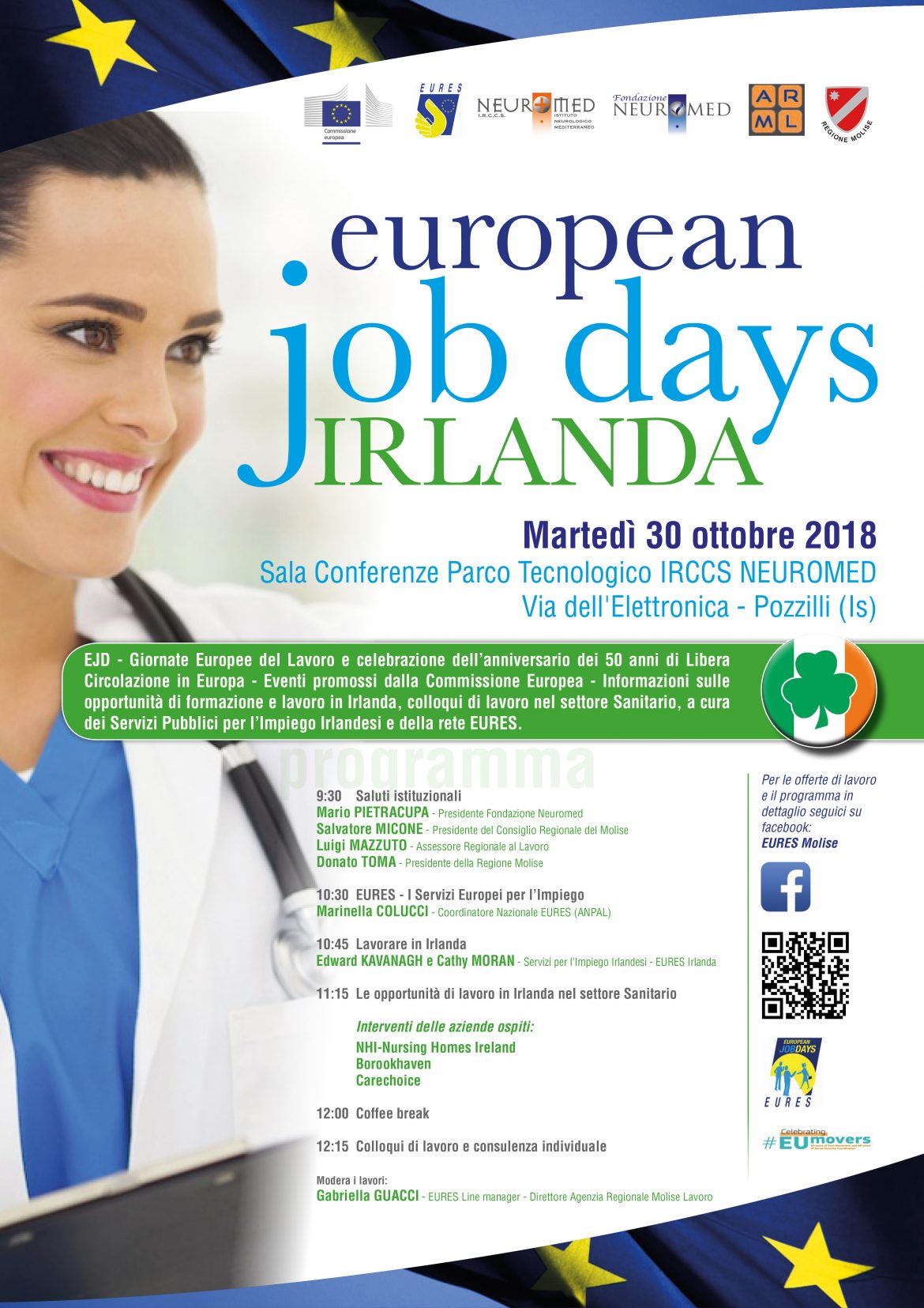 L’Istituto Neuromed e la sua Fondazione ospitano gli European Job Days Irlanda. Un incontro teso a fornire opportunità di formazione e lavoro in Irlanda, colloqui di lavoro nel settore sanitario. L’evento si terrà martedì, 30 ottobre 2018, a partire dalle 9.30 presso la sala Convegni del Parco Tecnologico Neuromed, in via dell’Elettronica, Pozzilli, in collaborazione con il Coordinamento Regionale EURES (Servizi Europei per l’Impiego) del Molise e il Servizio EURES Irlandese, in occasione dei 50 anni del Regolamento che ha istituito la libera circolazione in Europa.
