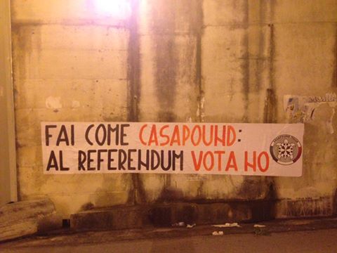 ‘Fai come CasaPound: al referendum vota no’. Questo il testo dello striscione affisso in nottata da CasaPound Italia a Campobasso in occasione dell’arrivo in città del ministro per le Riforme Costituzionali, Maria Elena Boschi, per partecipare ad un convegno in favore della riforma: “E’ stata la stessa Boschi ad indicare CasaPound come uno dei principali movimenti promotori del NO al referendum, e in occasione del suo arrivo in Regione abbiamo voluto ribadire la nostra posizione in merito alla riforma costituzionale su cui i cittadini saranno chiamati ad esprimersi il prossimo 4 dicembre”. Afferma CasaPound Italia in una nota.