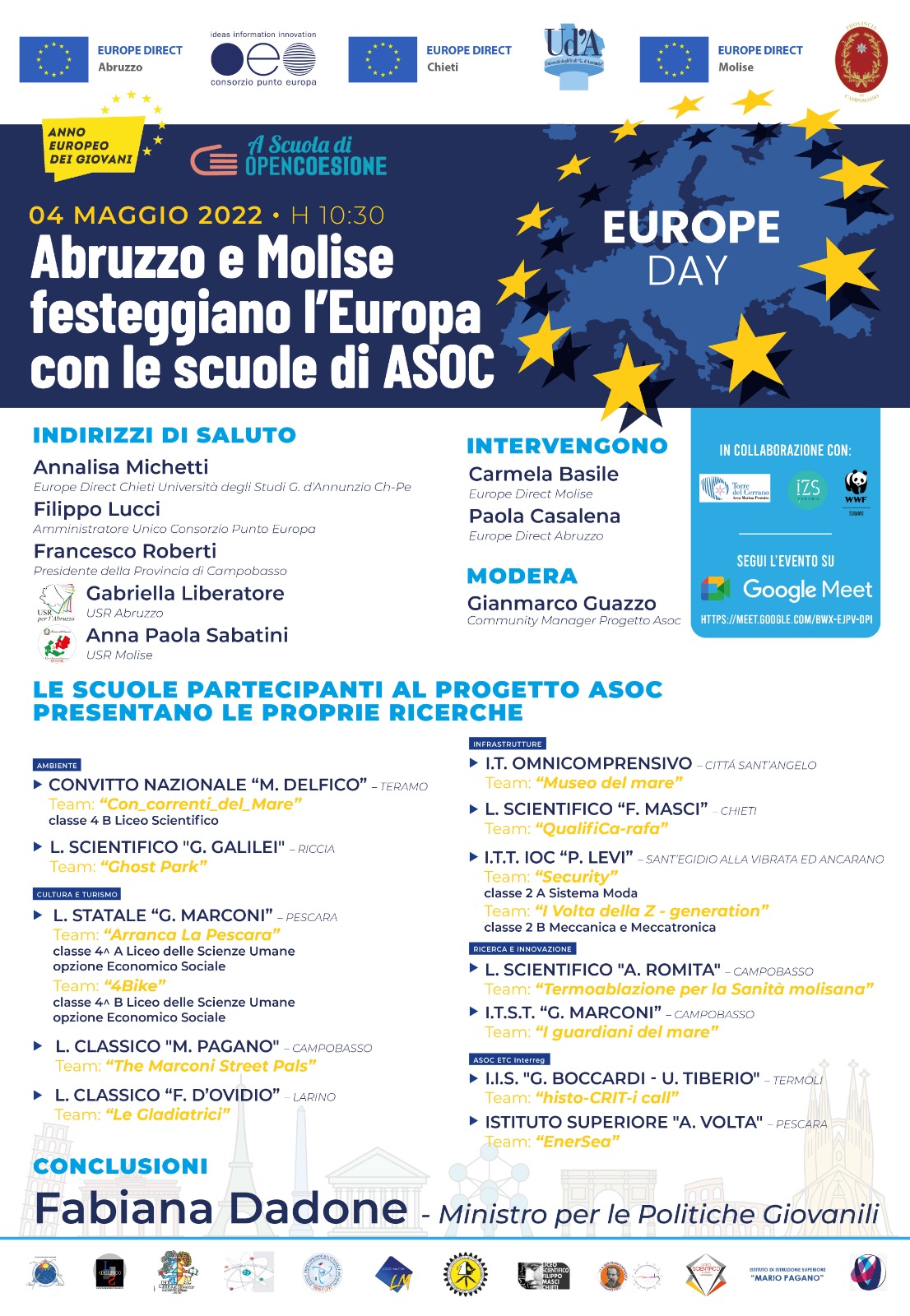 L’evento di domani, mercoledì 4 maggio 2022, dedicato proprio a celebrare il compleanno dell’Unione è incentrato sulla promozione del concetto di cittadinanza europea che si aggiunge quella italiana e che si potenzia anche attraverso un esercizio costante, come quello svolto dai 14 team abruzzesi e molisani, alle prese con un progetto nazionale divenuto europeo che prende il nome di A Scuola di Opencoesione.