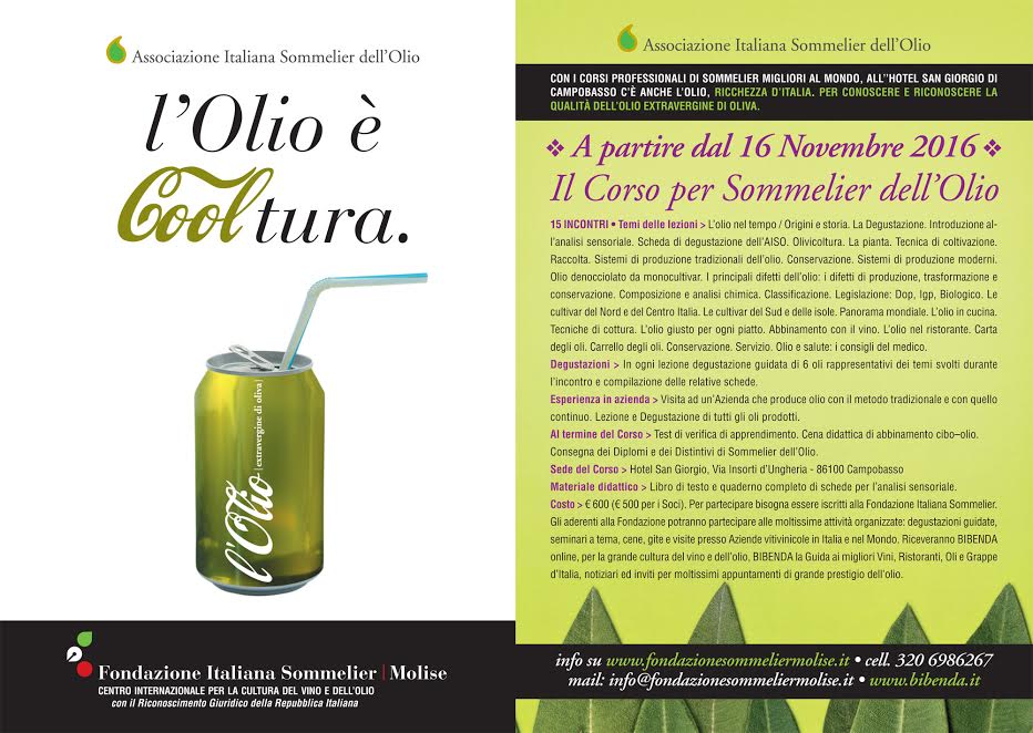 sommelier-dellolioDalla grande esperienza romana di oltre 25 anni e dopo il grande successo del 1° Corso organizzato a Campobasso, torna in Molise il Corso di Formazione di Sommelier dell’Olio.