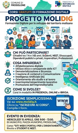 Tutte le informazioni sul progetto sono reperibili al sito al sito www.molidig.it al quale è possibile iscriversi cliccando sulla sezione ‘iscriviti ai corsi’ e compilando il form successivo.