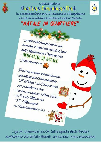 In programma per domani, sabato 22 dicembre 2018, la festa di Natale promossa dal ‘Quartiere Campobasso Nord’. Appuntamento alle 16,30 nel piazzale dove ha sede l’associaizone. Qui verrà, infatti, acceso il grande fuoco beneaugurante. A seguire, giochi per bambini e apertura del mercatino artistico realizzato a scopo benefico.