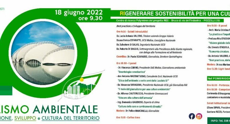 “Rigenerare sostenibilità per una cultura della cura”, Best practices development del territorio, è il tema sul quale si svilupperanno due Panel: etica e cultura dell’ambiente e buone pratiche e divulgazione mediatica. Tra i relatori interverranno esperti della realtà ambientale e giornalisti della realtà Nazionale UCSI di cui il presidente Vincenzo Varagona e il segretario Salvatore Di Salvo; in ambito giornalistico interverranno, inoltre, il presidente dell’Ordine dei Giornalisti del Molise Vincenzo Cimino e la presidente di UCSI Molise Rita D’Addona. Sull’etica e imprenditoria circolare interverrà anche la UCID (Unione Cristiana Imprenditori Dirigenti) con la relazione del Consulente Ecclesiastico Nazionale don Antonio Mastantuono e del Presidente provinciale UCID di Campobasso Ernesto D’Aquila. Sulla questione ambientale e dei cambiamenti climatici, interverranno dall’Associazione Greenaccord, il presidente Alfonso Cauteruccio e l’esperto di Clima Domenico Gaudioso. Riguardo alle buone pratiche ci saranno, infine, gli interventi di Maria Cristina Finucci, designer e architetto e di Antonio Lucio e Antonio Alessandro Valerio imprenditori del Gruppo Valerio. Nei saluti istituzionali ci sarà la presenza del Sottosegretario della Regione Molise con delega all’Istruzione e all’Ambiente Roberto di Baggio e della Consigliera Nazionale UCSI Enrica Cefaratti. I PANEL saranno moderati dai giornalisti di UCSI Molise Paolo Scarabeo e Felice Mancinelli e di Vatican News Marina Tomarro.