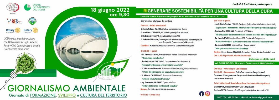 Giornalismo ambientale. Best practices: Da rifiuto a risposta, riutilizzare le competenze del territorio in un contesto di sostenibilità. La connessione tra la questione ambientale e la questione sociale per garantire la sostenibilità in favore di sviluppo economico e progresso sociale, è l’ambito di interesse che UCSI Molise ha individuato per la creazione di un evento di formazione giornalistica sul giornalismo ambientale. Sabato 18 giugno, dalle ore 9:30, avrà luogo l’iniziativa di formazione e di cultura dell’ambiente presso il nuovo Centro di Ricerca Polymères del progetto RES di Pozzilli (Isernia), al Bruco di via dell’Industria, inaugurato di recente dagli imprenditori Gruppo Valerio di cui fanno parte Antonio Lucio Valerio, Antonio Alessandro Valerio e Maria Valerio. Promossa da UCSI Molise in collaborazione con OdG Molise, Gruppo Valerio, Rotary Club Campobasso e Isernia, Associazione Greenaccord (ente terzo di formazione), la giornata di formazione giornalistica prevede l’attribuzione di 5 crediti formativi previa iscrizione sulla piattaforma Formazione OdG.