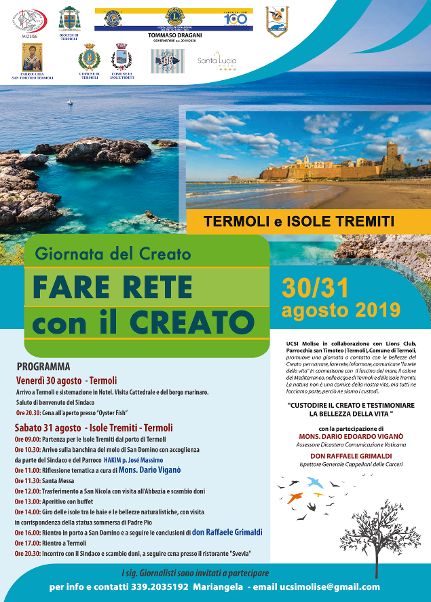 ‘Fare rete con il Creato’ è l‘iniziativa di promozione culturale, sociale e di comunicazione, nell’ambito della 14ma giornata Nazionale del Creato (1° settembre), promossa da UCSI Molise in collaborazione con Lions Club Tifernus di Termoli, Comune di Termoli, Comune di Tremiti (FG), Diocesi di Termoli –Larino e Diocesi di Manfredonia –Vieste, Parrocchia san Timoteo (Termoli).
