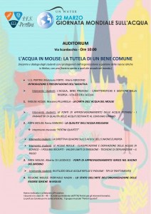 La giornata mondiale dell’acqua “World Water Day” è una ricorrenza istituita dalle Nazioni Unite nel 1992, prevista all’interno delle direttive dell’Agenda 21, risultato della Conferenza di Rio. Cade regolarmente ogni 22 marzo. Le Nazioni Unite attraverso la propria agenzia “Un Water” invitano gli Stati membri a dedicare questo giorno alle raccomandazioni suggerite dall’Assemblea generale e alla promozione di attività concrete all’interno dei loro Paesi.