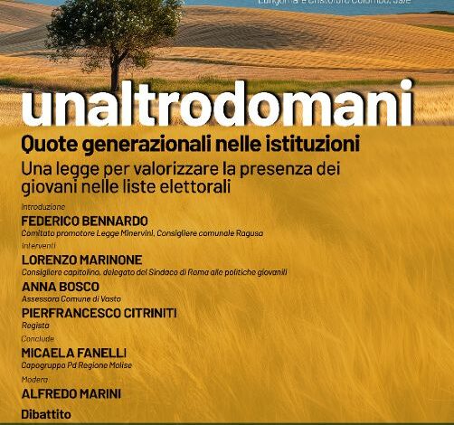 L’Associazione Politico-Culturale “Partecipa Molise” è lieta di annunciare un dibattito pubblico incentrato sui temi delle “Quote Generazionali nelle Istituzioni” e della proposta di legge “Guglielmo Minervini”. L’evento si terrà oggi, venerdì 11 luglio a Termoli, presso Cala Sveva, con inizio alle ore 18:00 a conclusione delle attività di “Un altro domani”, ciclo di conferenze territoriali nel Basso Molise. L’iniziativa è volta a promuovere una discussione approfondita su un argomento di fondamentale importanza per il futuro politico e sociale del nostro territorio: la valorizzazione della presenza dei giovani nelle liste elettorali e l’introduzione di meccanismi che garantiscano un’equa rappresentanza generazionale.
