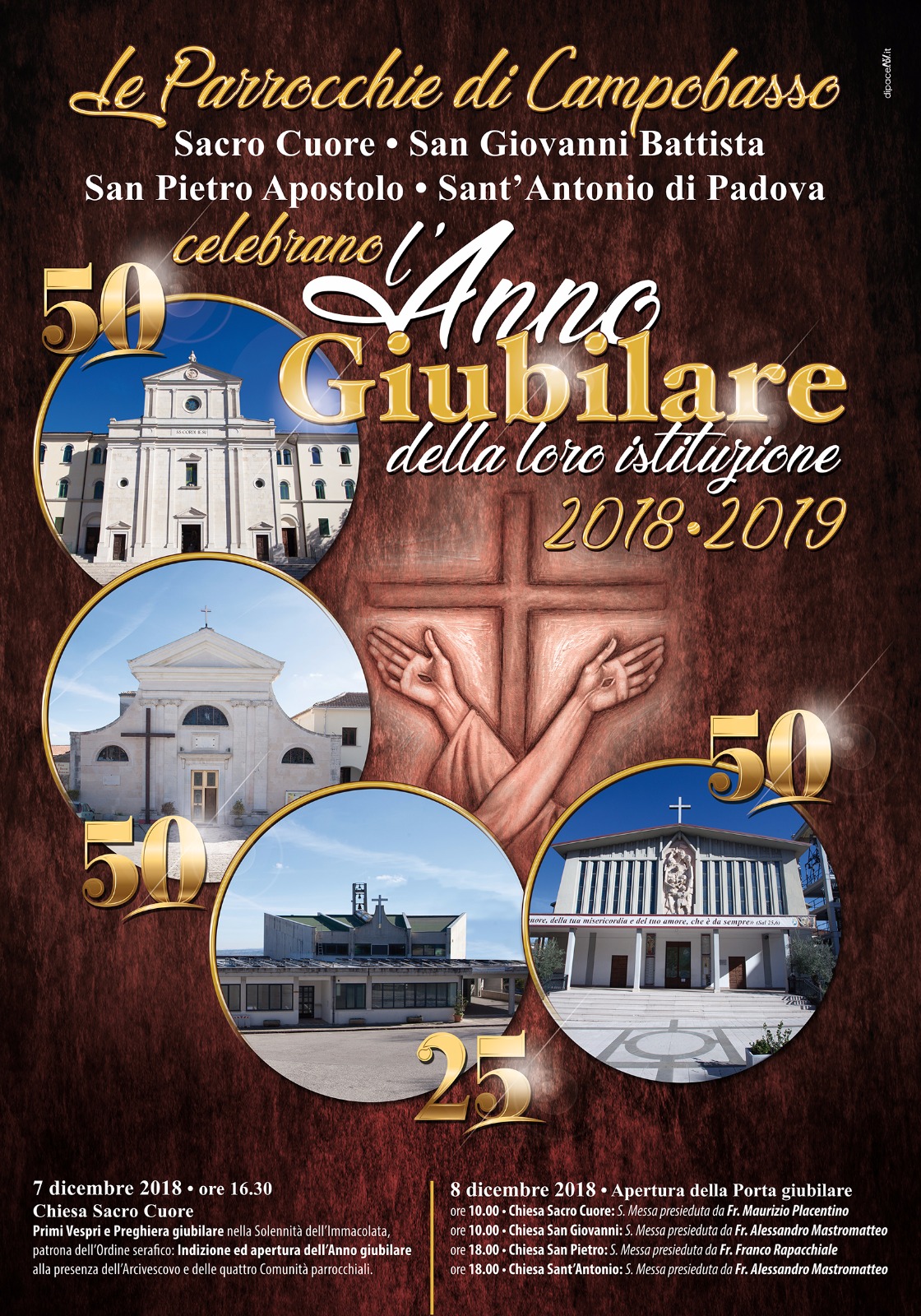 Venerdì 7 dicembre alle ore 16:30, nella Chiesa del Sacro Cuore, in Piazza san Francesco a Campobasso, vespri e mandato dell’Anno Giubilare alla presenza dell’arcivescovo di Campobasso-Bojano, GianCarlo Bregantini, e delle quattro Comunità parrocchiali francescane della città. Mentre sabato 8 dicembre, festività della Immacolata Concezione, patrona dell’ordine serafico, in coincidenza con il cinquantesimo anniversario della elevazione a parrocchia delle chiese francescane di San Giovanni Battista, di S. Francesco “Sacro Cuore”, Sant’Antonio Di Padova e di San Pietro Apostolo (che celebra il venticinquesimo), la fraternità religiosa, invita a partecipare tutto il popolo di Dio, all’apertura della “Porta Giubilare” (alle ore 10 a san Giovanni Battista e alle 18:00 a Sant’Antonio di Padova).