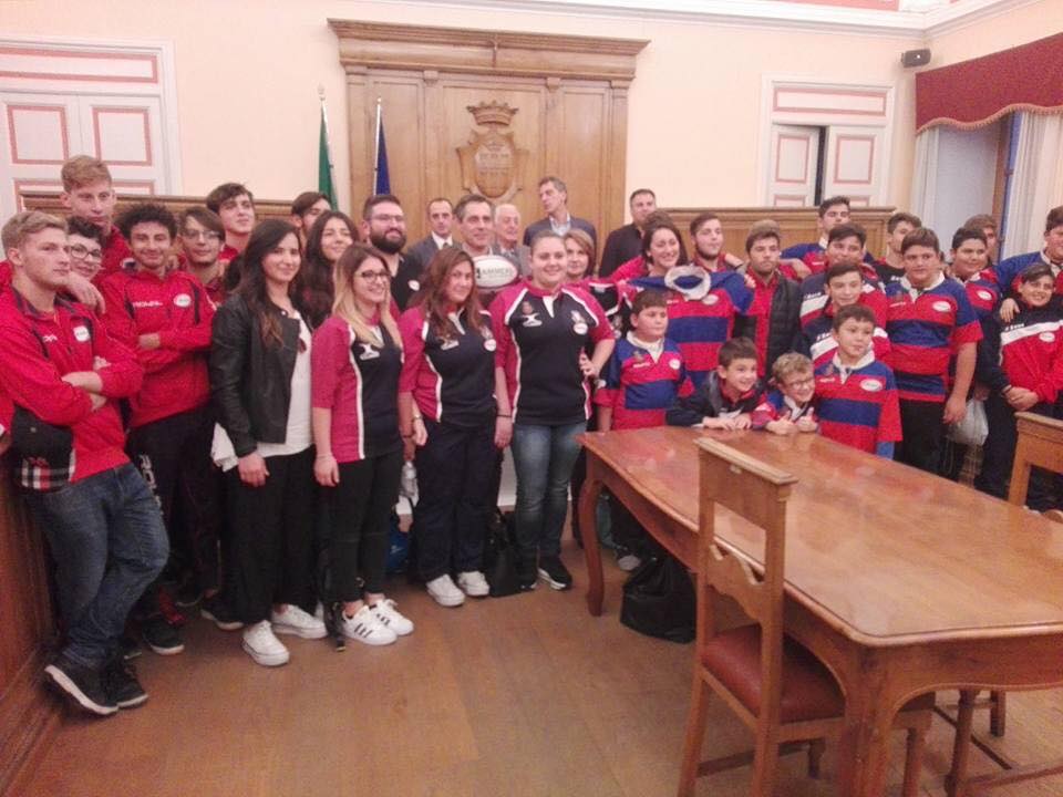 Una sala consiliare non solo completamente esaurita in ogni ordine di posto, ma traboccante di entusiasmo e passione tinteggiate di rossoblù, ha abbracciato idealmente e nel concreto l’intera società degli Hammers Rugby Campobasso che mercoledì 4 ottobre hanno presentato alla città il proprio progetto sportivo e sociale riguardante la stagione agonistica che va ad iniziare.A dimostrazione della considerazione che la società del capoluogo ha saputo conquistarsi sul campo in questi anni di lavoro, alla presentazione non è mancata nessuna delle autorità invitate, a cominciare dagli esponenti del Consiglio Comunale, con il presidente Michele Durante che ha accolto personalmente atleti e famiglie nel cuore del Palazzo Comunale e con il sindaco, Antonio Battista, che si è detto ancora una volta entusiasta del connubio creato tra la città e la sua squadra di rugby, capace di dare sostanza a valori importanti dal punto di vista sportivo e sociale.