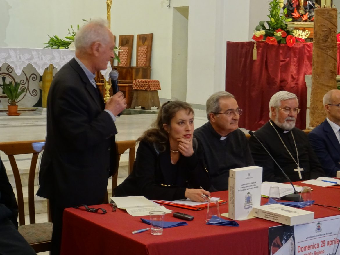 A fine aprile all’Arcivescovo Metropolita di Campobasso-Bojano, S.E. Mons. GianCarlo Maria Bregantini, è giunta una Lettera dal Vaticano, della Segreteria di Stato della Santa Sede per la Giornalista Bojanese Rita Carla Codispoti, che ha realizzato, perché voluto fortemente dall’Arcivescovo Bregantini, il Libro “La Fede e la Carità dell’Arcivescovo, S.E. Mons. Antonio Nuzzi”, dell’Arcidiocesi di Campobasso-Bojano a cura di Rita Carla Codispoti, Responsabile delle Comunicazioni Sociali dell’Antica Cattedrale della Città di Bojano dall’anno 2008, nominata dall’Arciprete Don Rocco Di Filippo, Parroco dell’Antica Cattedrale. Il Libro, di 734 pagine, è edito da AGR Editrice (Arti Grafiche La Regione), rappresentata dal titolare Gianfranco Galati, di Campobasso ed è stato presentato il 29 aprile 2018 nell’Antica Cattedrale, alla presenza dell’Arcivescovo Bregantini, dell’Arciprete Don Rocco Di Filippo, degli altri Parroci della Città di Bojano, Don Giovanni Di Vito, Don Alessandro Iannetta, dei Parroci dell’Area Matesina, Don Nicola Giannantonio e Don Luigi Astarita e di altre Autorità ecclesiali, civili e militari.