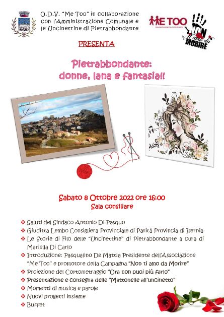 Domenica 9 ottobre la manifestazione verrà replicata a Pietrabbondante. Sempre a partire dalle ore 16, nella sala consiliare del Comune, il sindaco Antonio Di Pasquo accoglierà organizzatori e partecipanti. La consigliera di Parità Giuditta Lembo aprirà la serata spiegandone il significato e illustrando le attività in corso per contrastare la violenza di genere, quindi Mariella Di Carlo racconterà in che modo viene attuata l’opera delle Uncinettine di Pietrabbondante. Il presidente di MeToo Pasqualino De Mattia presenterà un bilancio della campagna ‘Non ti amo da morire’, dopodiché si passerà alla proiezione del cortometraggio dal titolo ‘Ora non puoi più farlo’, infine ci saranno la consegna delle mattonelle all’uncinetto alle autorità e dei momenti musicali.