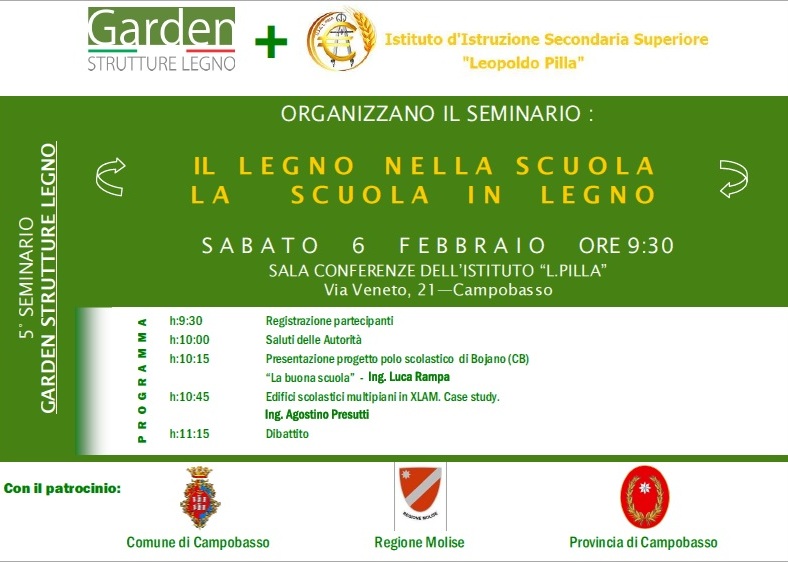 In programma per domani, sabato 6 febbraio a partire dalle 9.30 nell’Aula Magna dell’Istituto d’Istruzione Scolastica Superiore ”Leopoldo Pilla” di via Veneto a Campobasso, il seminario “Il legno nella scuola – La scuola in legno”.