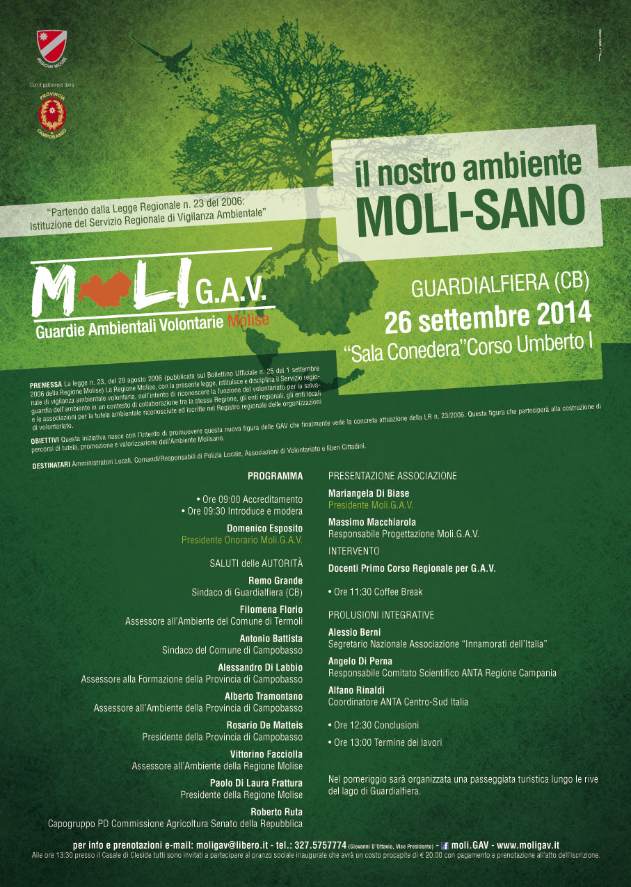 L’associazione Moli.G.A.V., guardie ambientali volontarie del Molise, dopo aver debuttato in pubblico al Green day nello scorso fine settimana è pronta a presentarsi ufficialmente nell’evento ‘Il nostro ambiente ‘Moli-Sano’.