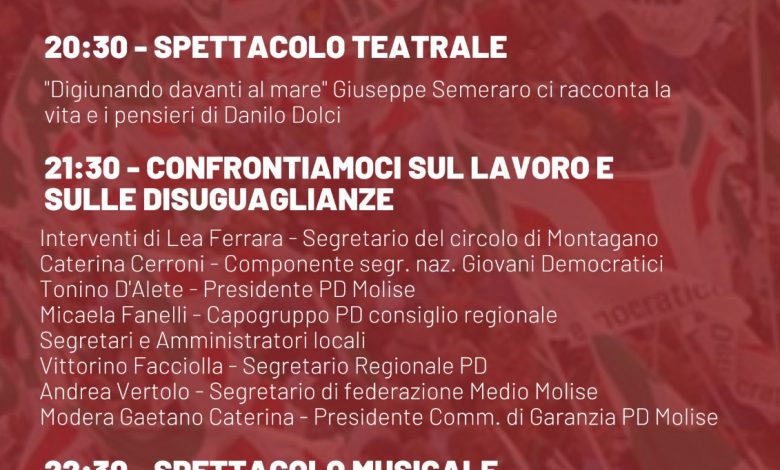 Il lavoro e le disuguaglianze al centro del dibattito politico che vedrà sul palco gli interventi del segretario regionale Vittorino Facciolla, della capogruppo PD in Consiglio regionale Micaela Fanelli, del segretario di Federazione Andrea Vertolo, del segretario del circolo di Montagano Lea Ferrara, il presidente Pd Molise Tonino D’Alete e della componente della segreteria nazionale dei Giovani Democratici Caterina Cerroni.