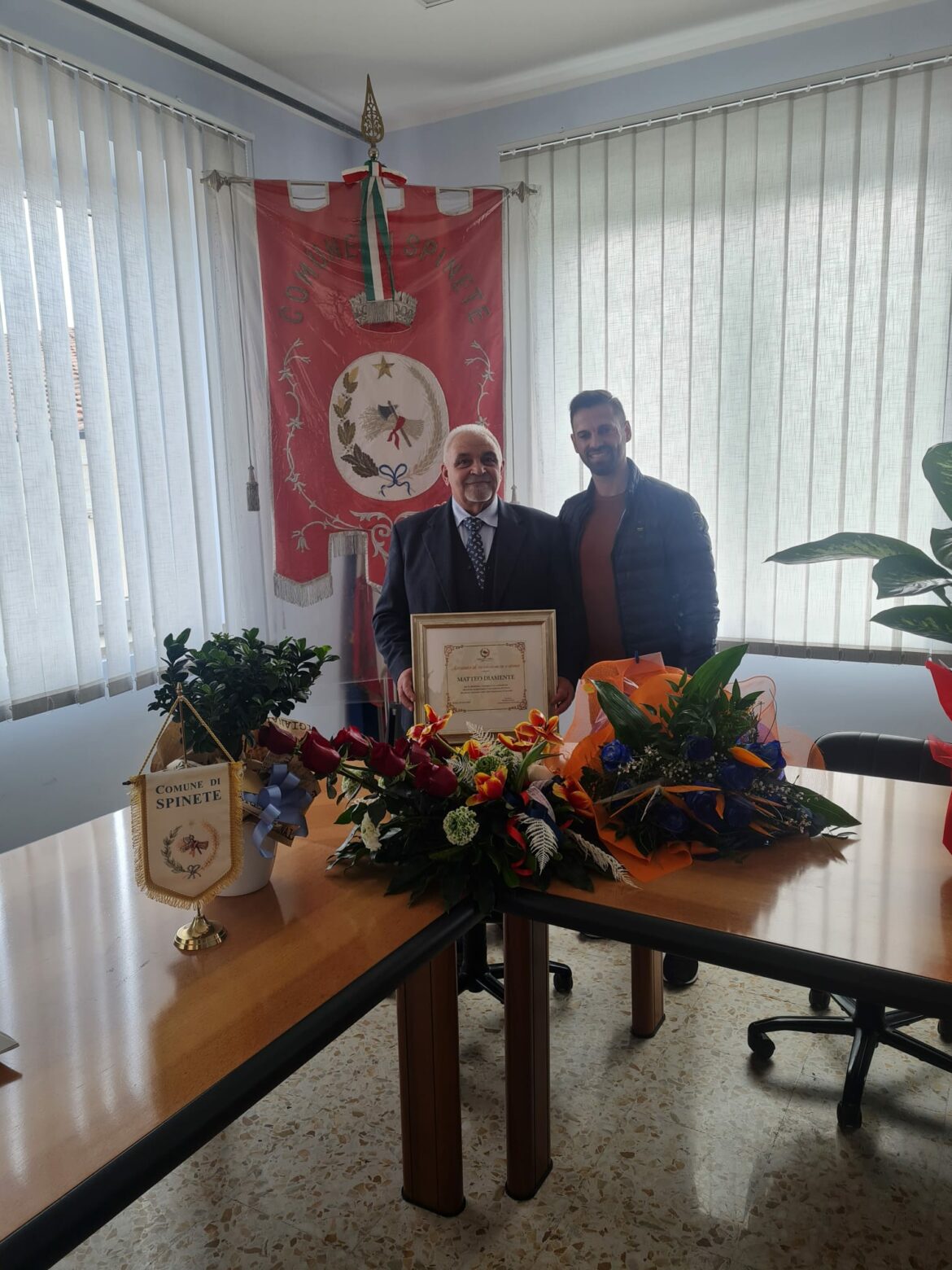 Il sindaco Michele Di Iorio ha voluto ringraziarlo personalmente, a nome dell’amministrazione e di tutta la comunità locale: “la carriera lavorativa di Matteo è stata sempre dedita alla comunità, con forte spirito di abnegazione, sempre al passo con i tempi, al punto da essere considerato un riferimento dai suoi colleghi dello Stato Civile e dell’anagrafe dei comuni limitrofi e non solo, collaborando fattivamente con colleghi e amministratori nel corso degli anni. Voglio ringraziarlo per il servizio reso alla nostra comunità, con una cornice simbolica come gesto di gratitudine per l’impeccabile lavoro svolto negli oltre 40 anni di attività per la cittadinanza di Spinete. A lui vanno i migliori auguri per il meritato riposo”.