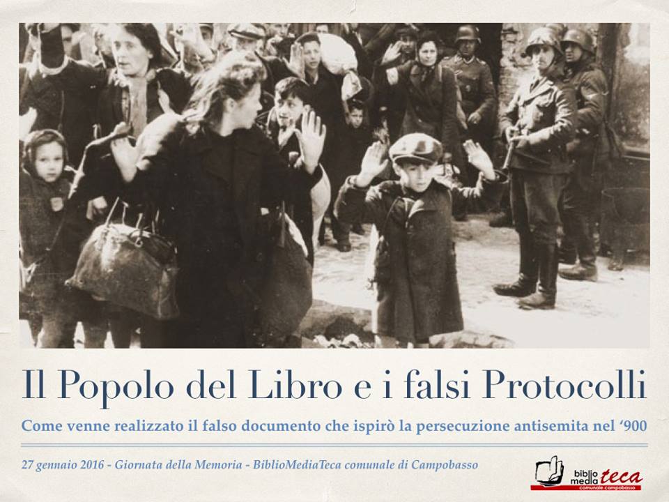 In occasione della Giornata della Memoria, da mercoledì 27 gennaio e fino al 3 febbraio 2016, nell’atrio d’ingresso della BiblioMediaTeca comunale di Campobasso in via Alfieri, sarà liberamente visitabile un’esposizione in venti tavole che spiega come venne realizzato, da chi e perché, il più grande falso documento antisemita della storia, ovvero i Protocolli dei Savi di Sion.