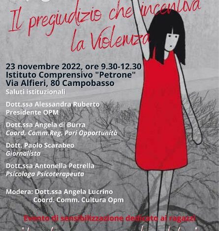 L’Ordine degli Psicologi del Molise nella giornata del 23 novembre affronterà il tema delicato della violenza contro le donne con gli studenti dell’Istituto Petrone di Campobasso.