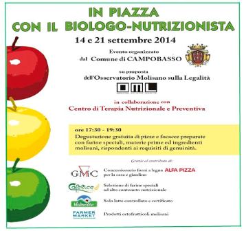 Domenica 21 settembre, il Comune di Campobasso, su proposta dell’Osservatorio Molisano sulla Legalità, in collaborazione con il ‘Centro di terapia nutrizionale e preventiva’ di Antonio D’Alesio organizza l’evento “In piazza con il biologo-nutrizionista”.