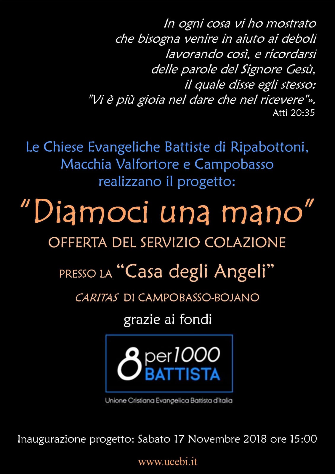 “In ogni cosa vi ho mostrato che bisogna venire in aiuto ai deboli”. La giornata mondiale dei poveri istituita lo scorso anno da Papa Francesco, stimola le realtà periferiche dei piccoli centri urbani come il capoluogo del Molise, Campobasso, a realizzare iniziative concrete in favore delle prossimità e dei poveri. La rinascita delle città e dei piccoli borghi parte anche da un’economia solidale che pone al centro la persona . La caritas diocesana guidata da don Franco D’Onofrio promuove il progetto “Diamoci una mano” con la finalità di offrire il servizio colazioni presso la mensa caritas “Casa degli Angeli” grazie ai fondi 8×1000 della Chiesa Evangelica Battista delle comunità di Ripabottoni, Macchia Valfortore e di Campobasso.