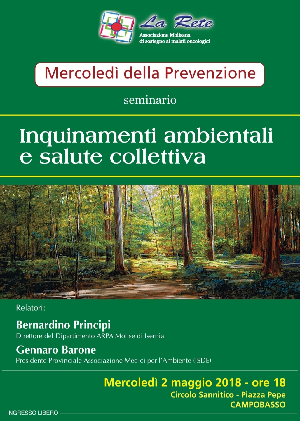 L’evento vedrà la partecipazione del Direttore del Dipartimento ARPA Molise di Isernia, Bernardino Principi e di Gennaro Barone, Presidente Provinciale Associazione Medici per l’Ambiente (ISDE).