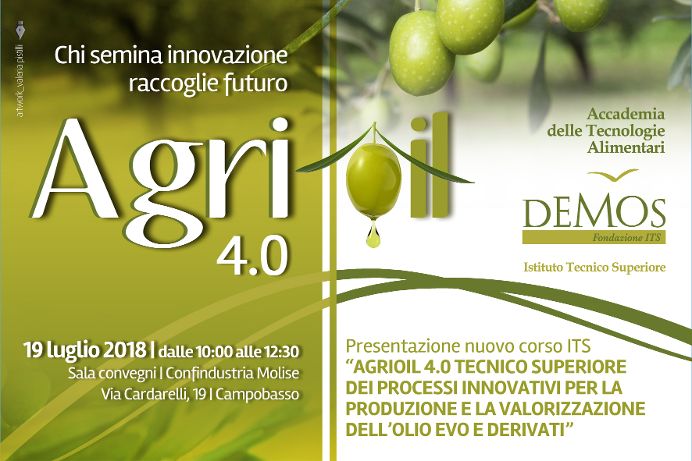Un momento di confronto per sancire il sodalizio tra alta formazione tecnica ed occupazione si terrà giovedì 19 luglio alle ore 10 presso la sala convegni di Confindustria a Campobasso. “AgriOil 4.0: Tecnico Superiore dei processi innovativi per la produzione e la valorizzazione dell’olio Evo e derivati”, sarà questo il corso che partirà il prossimo autunno, iscrizioni già attive fino al 12 ottobre.
