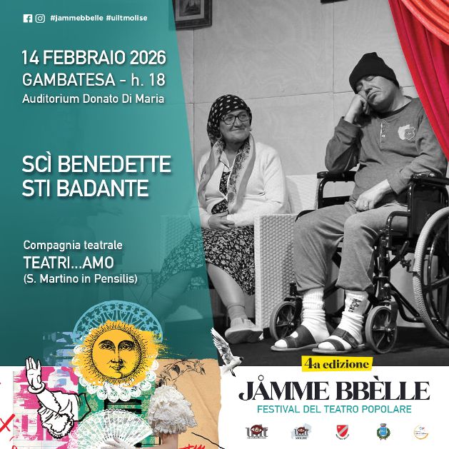 Il festival itinerante – organizzato dalla UILT Molise e giunto alla sua quarta edizione – presenta la compagnia “Teatri… amo” di San Martino in Pensilis, che porta in scena la commedia brillante in due atti di Giancarlo Verdecchia “Sci Benedette ste badante”.