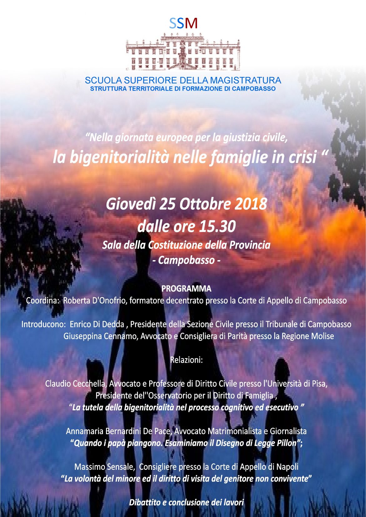 “L’argomento è estremamente attuale e molto coinvolgente in questo particolare momento storico”, ha detto l’avvocato Giuseppina Cennamo, consigliera di Parità della Regione Molise, che tra l’altro presenterà l’evento insieme al Presidente della sezione Civile del Tribunale di Campobasso, Enrico Di Dedda. “È infatti all’esame della Commissione giustizia del Senato il Ddl presentato dal senatore Pillon, primo firmatario, che contempla modifiche sostanziali e procedurali alla L. 54/2006, più conosciuta come la legge sull’affido condiviso”, ha concluso la Cennamo.