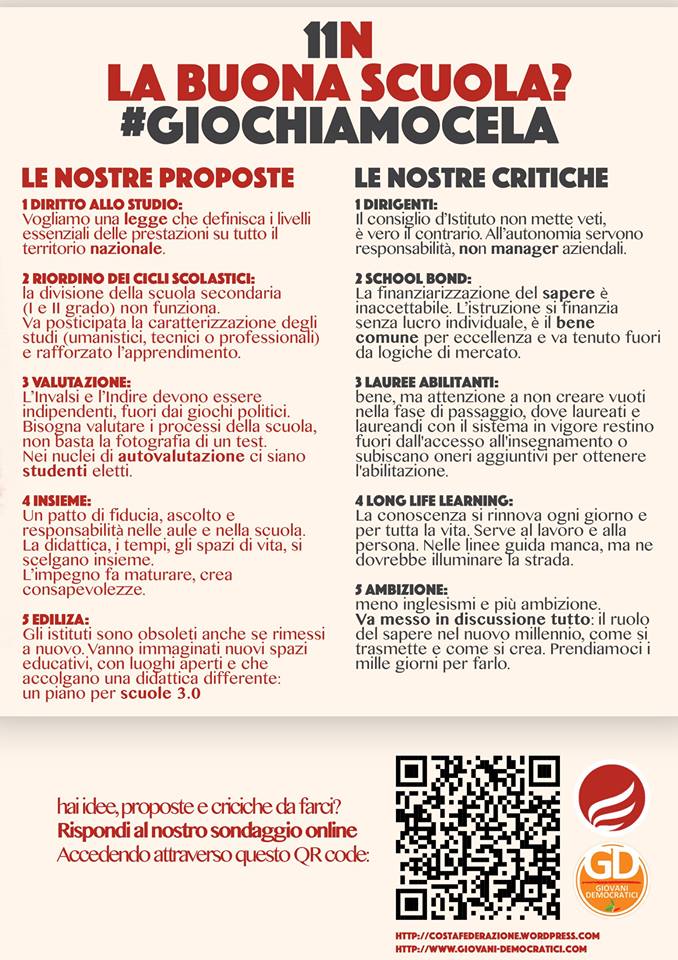 Sono necessari più investimenti per l’edilizia scolastica perché tropi istituti dono obsoleti. Vanno immaginati nuovi spazi, con luoghi aperti e con una didattica differente. Al contempo bisogna ampliare gli sforzi per la digitalizzazione delle scuole e ridurre il peso della burocrazia. Diciamo si a una legge sul diritto allo studio, che definisca i livelli essenziali delle prestazioni su tutto il territorio nazionale. Siamo favorevoli all’innalzamento dell’obbligo scolastico fino a 18 anni. Condividiamo inoltre la preoccupazione per i criteri con i quali si vuole attuare la distinzione tra docenti meritevoli e non. Tali criteri non possono in alcun modo essere il frutto di giochi politici. Bisogna valutare i processi della scuola, non basta la fotografia di un test. Nei nuclei di autovalutazione ci siano studenti eletti. A partire dalle idee che raccoglieremo tra gli studenti, presenteremo un documento di proposte al Partito Democratico, al Presidente del Consiglio Matteo Renzi e al Ministro della Pubblica Istruzione Stefania Giannini, perché la sfida del cambiamento non si fermi ad aggiustare ciò che non va, ma ci faccia gettare il cuore oltre l’ostacolo, ci dia l’ambizione di andare fino in fondo. E giocarcela.