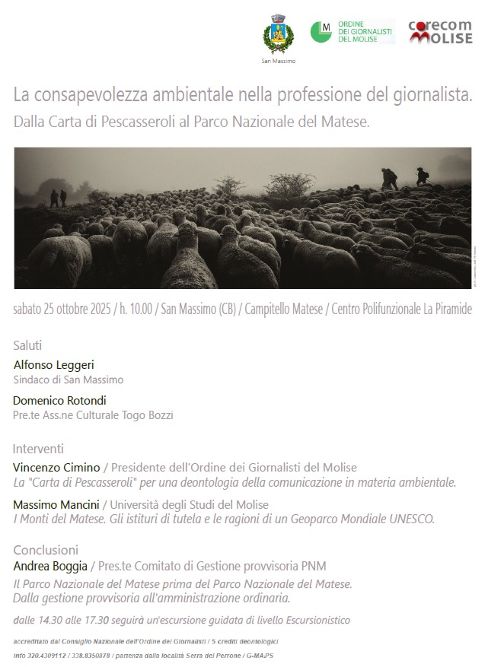 Sabato 25 ottobre 2025, alle ore 10.00, presso il Centro Polifunzionale “La Piramide” di Campitello Matese (San Massimo – CB), l’Ordine dei Giornalisti del Molise, in collaborazione con il Corecom e con il patrocinio del Comune di San Massimo, promuoverà un incontro di alto profilo culturale e civile dedicato al tema “La consapevolezza ambientale nella professione del giornalista. Dalla Carta di Pescasseroli al Parco Nazionale del Matese.”